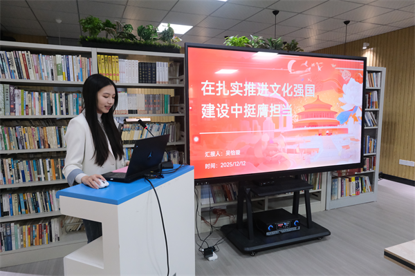 支部书记吴怡璇以“在扎实推进文化强国建设中挺膺担当”为题,作了专题领学,带领大家深入学习了文化强国建设的战略意义,号召大家结合人文社科专业特点,在传承中华优秀传统文化、推动文化创新中主动作为,以实际行动践行新时代青年的使命担当。