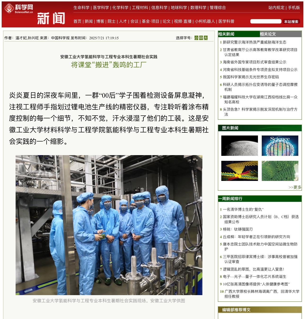 自暑期社会实践启动以来,实践团队横跨安徽、江苏等地,开展深度探访与沉浸式学习调研。在江苏国轩新能源有限公司,同学们走进104Ah锂电池生产线,亲身体验合浆均匀性、涂布精度控制等核心工艺的自动化跃升;转战安庆英科医疗,他们与企业技术骨干围坐研讨,就医疗材料选择与工艺优化展开头脑风暴;而在安徽天康集团,队员们亲手操作高精度仪器,验证课堂所学知识。企业实践让同学们看清了技术转化的全貌,更将“产学研融合”转化为触手可及的实践路径。