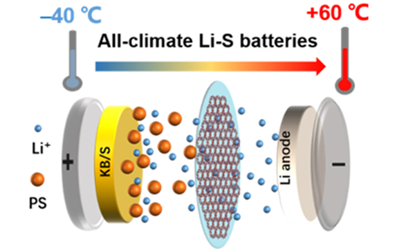 锂-硫电池因具有超高理论能量密度(2600 Wh kg-1)、低成本和硫资源丰富等优点而认为是最具潜力的下一代能源存储器件之一。然而,反应动力学缓慢和充放电中间产物(多硫化物)的穿梭效应严重阻碍了锂-硫电池的实际应用。特别是,硫转化的反应动力学在低温条件下极其缓慢,限制了锂-硫电池在低温工况下的使用。此外,多硫化物在高温下的穿梭量急剧增加,导致容量快速衰减和寿命缩短。因此,传统锂-硫电池难以满足宽温工况下(如‒40 ℃~60 ℃)的实际应用需求。