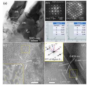 图5 B4C‒SiC‒ZrB2复相陶瓷的显微组织及界面结构