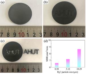 碳化硼(B4C)陶瓷作为一种重要的结构工程材料,在耐磨部件、研磨介质、轻质装甲、核屏蔽材料等领域具有广阔的应用前景。由于B4C陶瓷具有难烧结、超高硬度和本征脆性的特点,复杂形状致密B4C工程构件的性能及加工效率低、成本高昂。为了解决这一问题,研究团队设计、制备了B4C‒TiB2导电复相陶瓷。TiB2导电第二相不仅对B4C基体有良好的强韧化效果,而且极大地提升了其电导率,所制备的导电复相陶瓷可使用电火花加工技术进行快速加工。