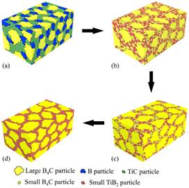 图3两步法制备B4C–TiB2复相陶瓷的工艺及显微结构演变示意图