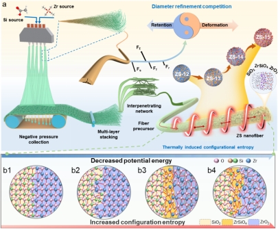 陶瓷纤维气凝胶在极端高温环境下的多功能性与耐高温性能至关重要,但其应用长期受限于纳米陶瓷纤维的脆性、高温晶粒生长问题及多功能协同优化难题的制约。传统方法通过引入不同维度功能组元来提升性能,但往往会导致重量增加、成本上升或高温稳定性不足。因此,如何通过单一纤维的微结构设计与多尺度组装实现轻质、高强、耐高温及隐身性能的集成仍具挑战。团队提出了一种通过热诱导相变与界面演化行为调控硅锆陶瓷纳米纤维构型熵值及热物理特性的新策略,结合压力辅助收集技术优化纤维细度、长径比与堆叠结构,成功制备了多尺度结构陶瓷纤维气凝胶材料,在机械、声学、隔热及微波吸收方面都展现出优异性能,解决了传统陶瓷气凝胶脆性与高温性能衰减的难题。