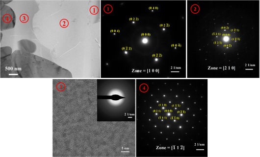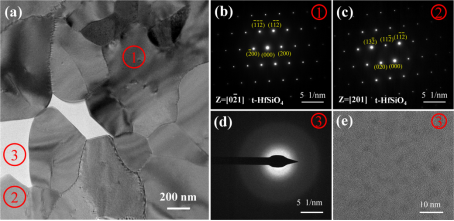 热处理HfO2-SiO2(1:1.8)涂层的TEM图及其相关区域的SAED图