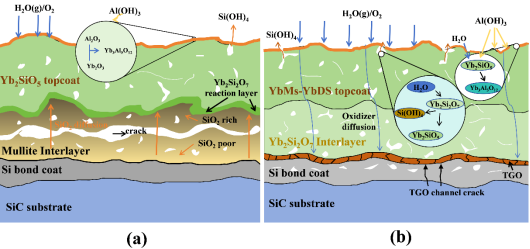 (a) Si/Mullite/Yb2SiO5和(b) Si/Yb2Si2O7/Yb2Si2O7-Yb2SiO5EBC体系1350℃水氧腐蚀动力学及其水氧腐蚀机理示意图