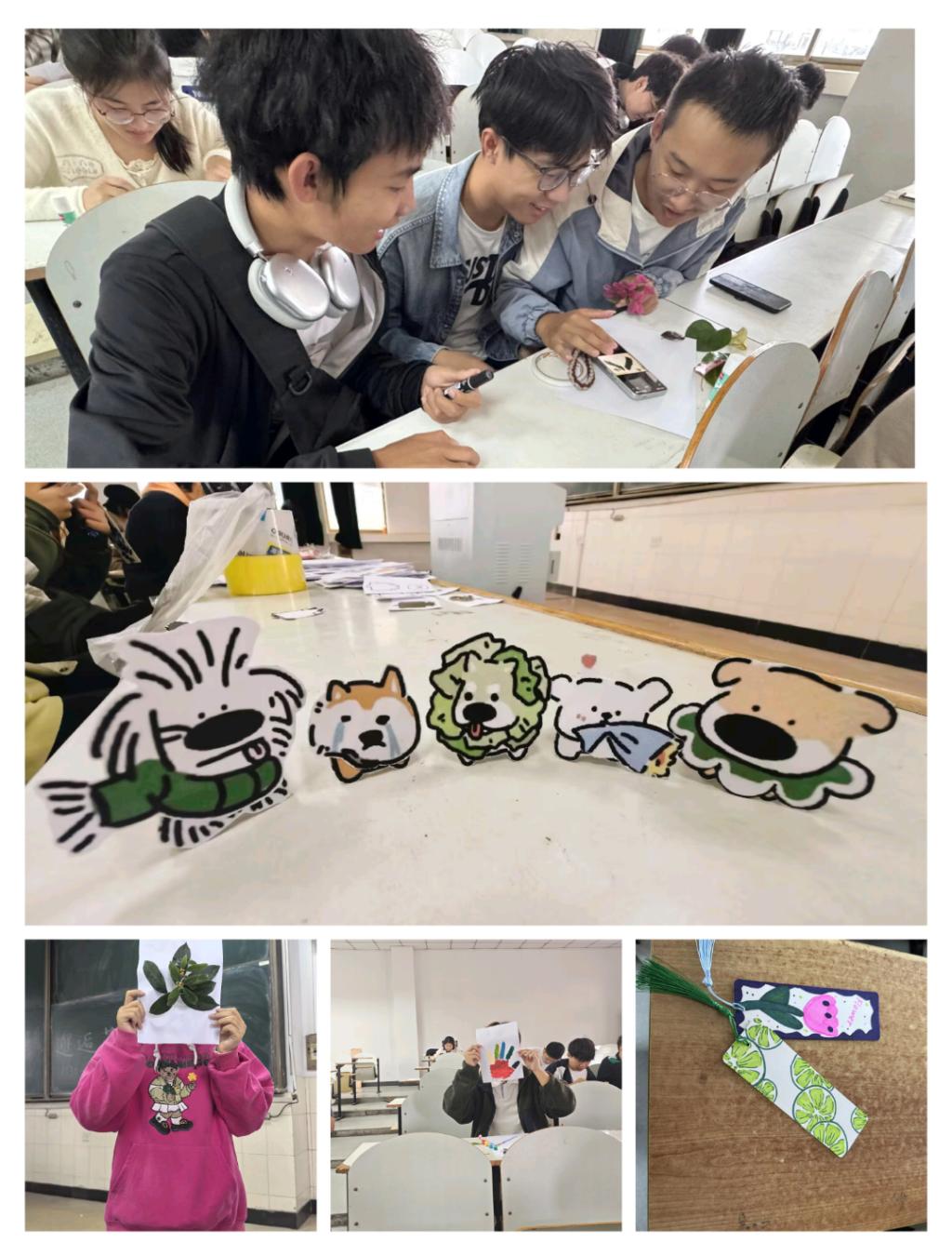 本次活动围绕“艺术疗愈、情绪表达、自我成长”展开,精心设计了体验式、沉浸式手工项目。“自然拼贴”环节,同学们利用预先备好的植物标本,通过构思、拼接与固定,将形态各异的叶片与花瓣转化为一幅幅生动的装饰画作;“掌心彩绘”环节,同学们以手为笔,勾勒出对未来的愿景与想象;“创意书签”环节,同学们充分发挥创意,把最想说的心里话通过色彩和文字诉诸笔端;“小狗集市”活动区则成为情感寄托的角落,同学们留下心理寄语,制作小狗装饰纸,传递祝福与关怀;抽奖环节更是将活动气氛推向高潮,欢声笑语不断。
