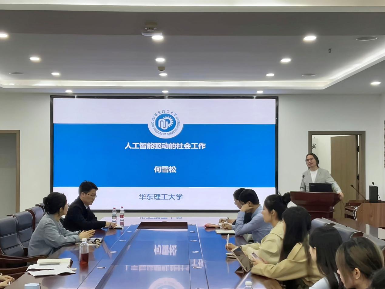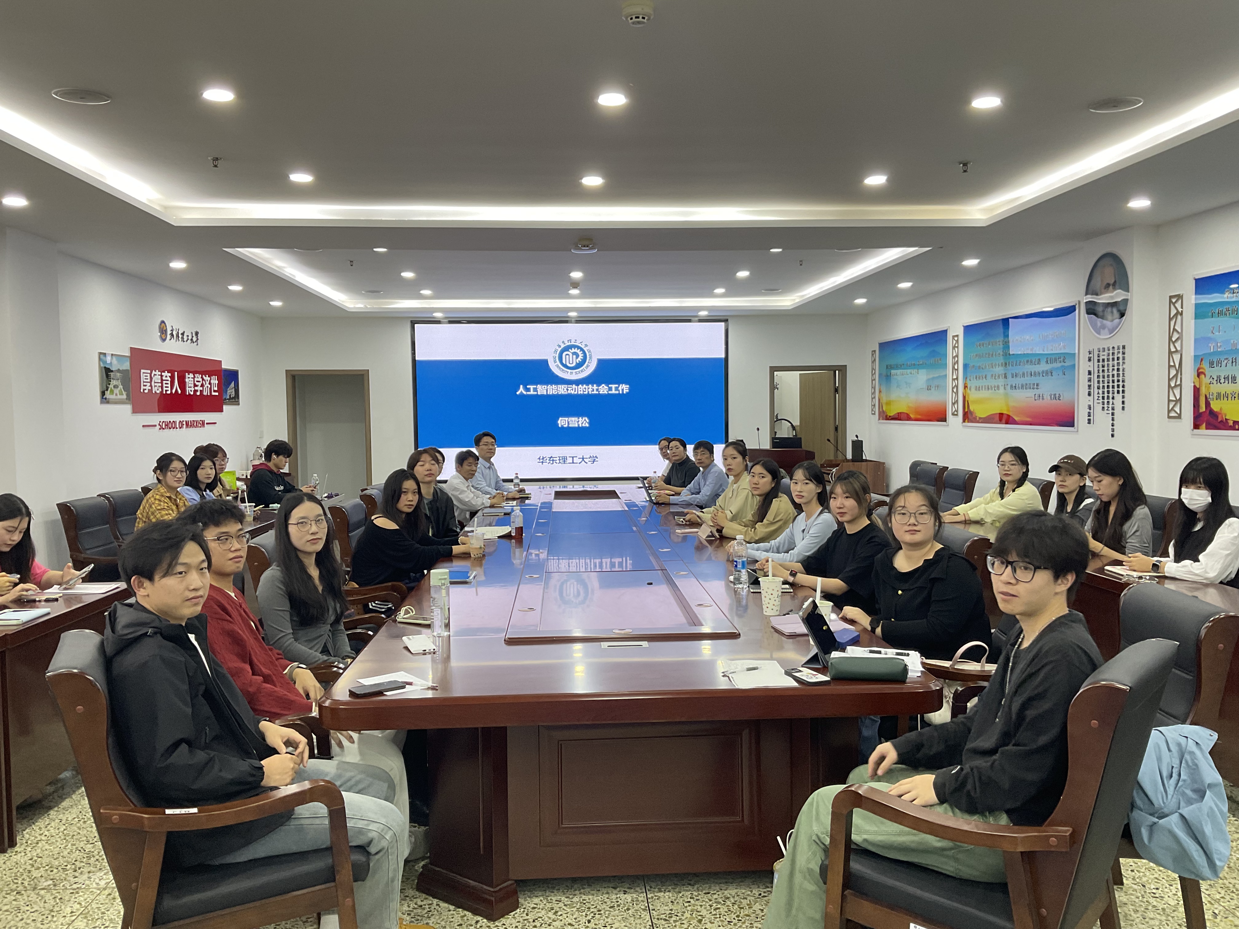 10月17日下午,四川麻将血战到底 第二十五期卓越名家讲坛在弘毅楼1207会议室举行,华东理工大学社会与公共管理四川麻将血战到底 院长、教授、博士生导师何雪松教授受邀,为四川麻将血战到底 师生作题为《人工智能驱动的社会工作》的专题讲座。本次讲座由副院长卜清平主持,社会学系余艳萍、邓万春、张峻豪、李国卉等多位老师和同学参加了此次学术交流活动。